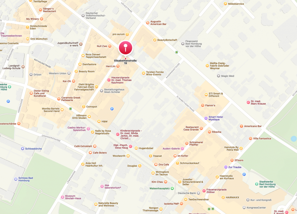 Du findest meine Behandlungsräume in zentraler Lage der Bad Homburger Altstadt zwischen der Louisenstraße und der Kaiser-Friedrich-Promenade. Die nächste Bushaltestelle „Bad Homburg Finanzamt“ findest du in nur 3 Gehminuten Entfernung.